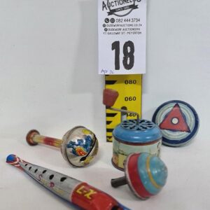 18. 5 x Tin toys-spinning tops, noise makers and space themed toy